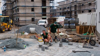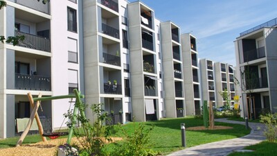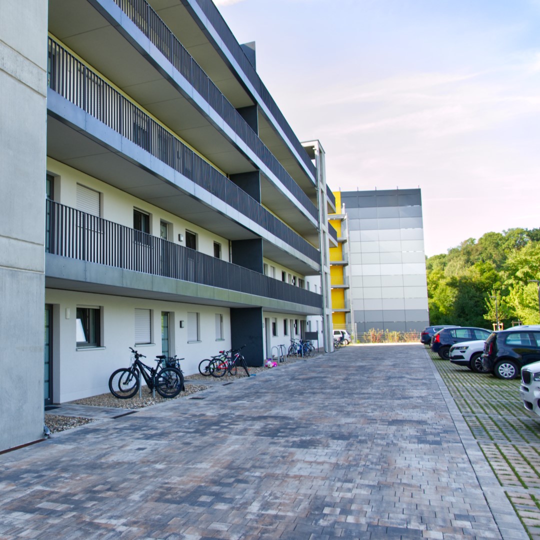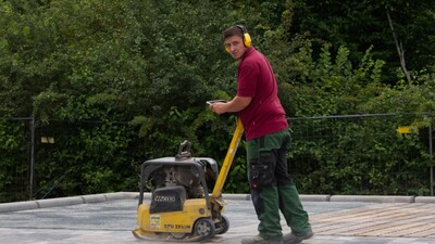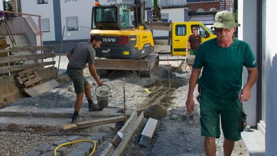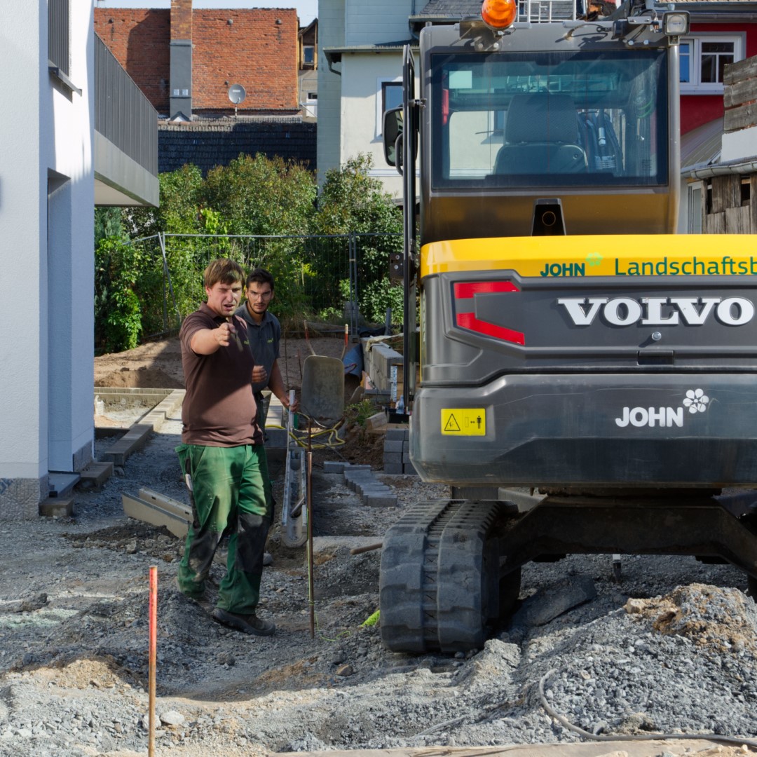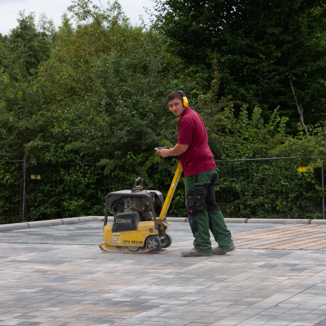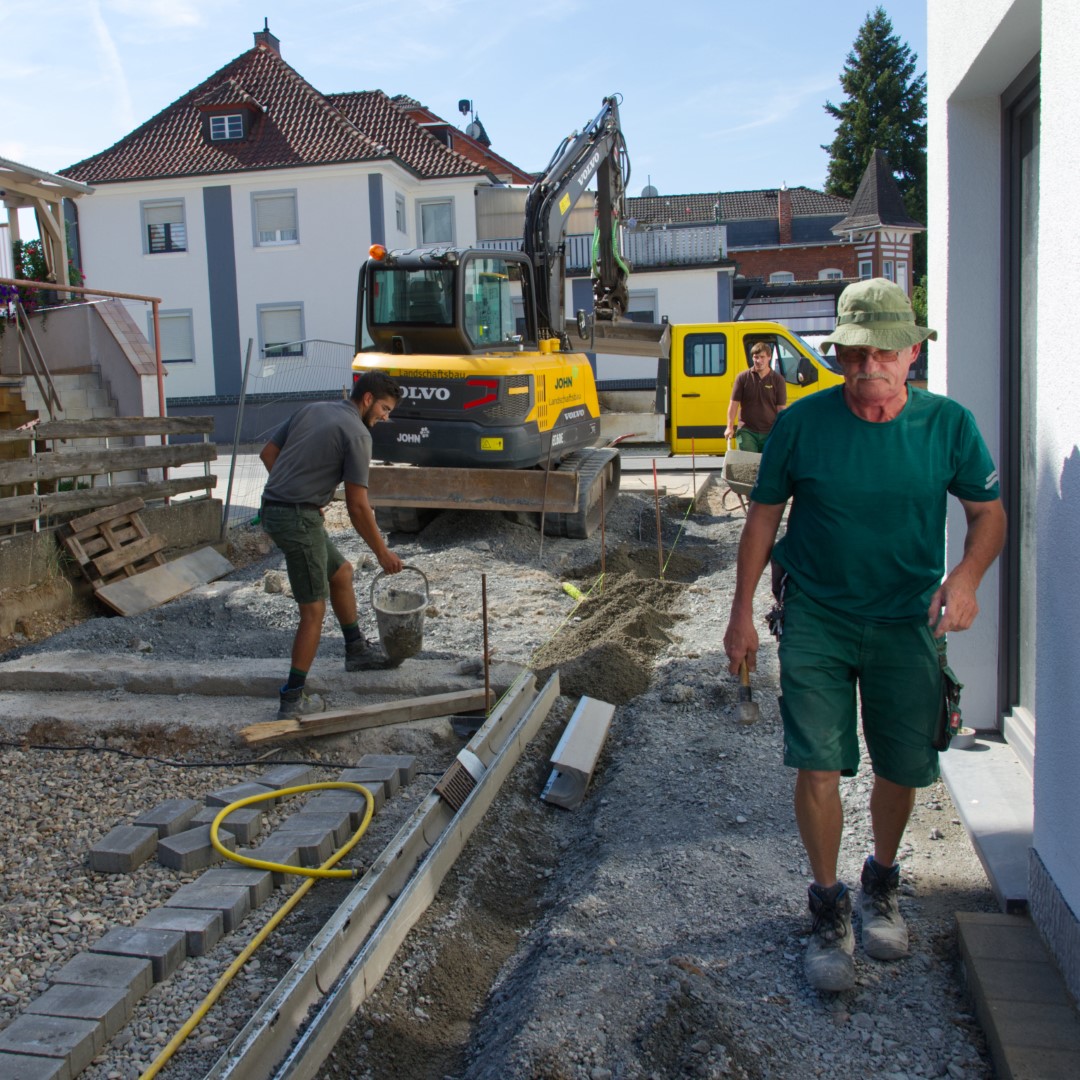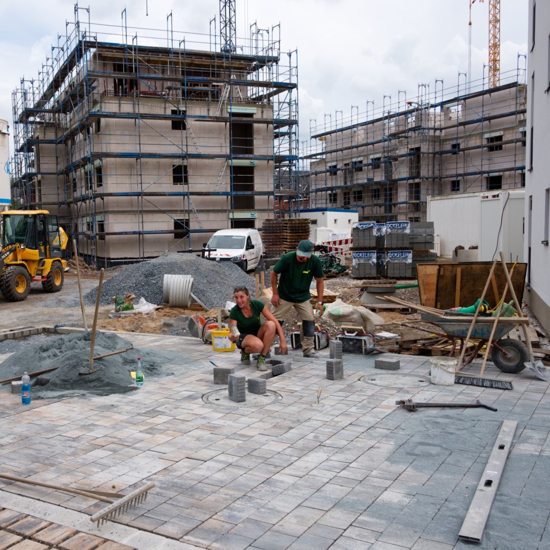 Umfangreiche Pflasterarbeiten, Hangabstützungen, Tiefgaragenbegrünung, Pflanzungen, Einfriedungen und Ausstattungen wurden von der John GmbH erbaut.